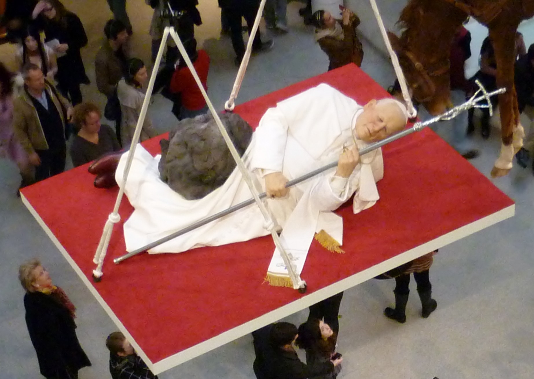 - 로렌스가 마침내 교황으로서의 이름을 정하고 그 뜻을 주님께 전하자마자 우렁차게 내려지는 천벌. 비스듬히 쓰러져 눈을 끔뻑이는 모습이 마우리치오 카텔란의 "La Nona Ora" (The Ninth Hour)와 비슷해 보입니다.